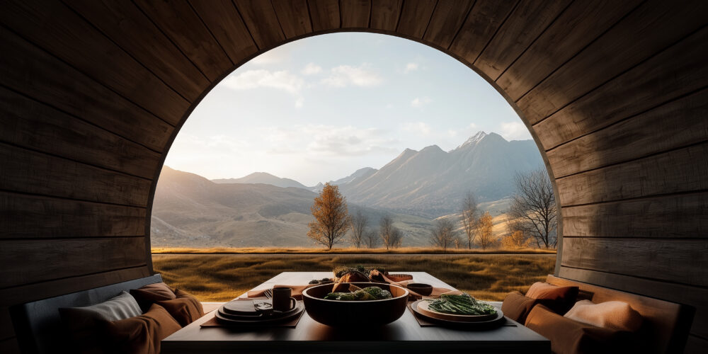 The project is customisable and can integrate different functional configurations, including living spaces, dining areas and panoramic environments for collective or working activities. The flexibility of the system allows adaptation to different contexts, from outdoor hospitality and glamping to interventions in natural or cultural settings, maintaining a balance between functionality, comfort and landscape integration.