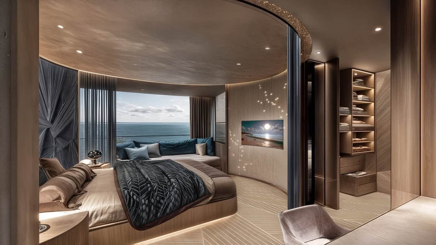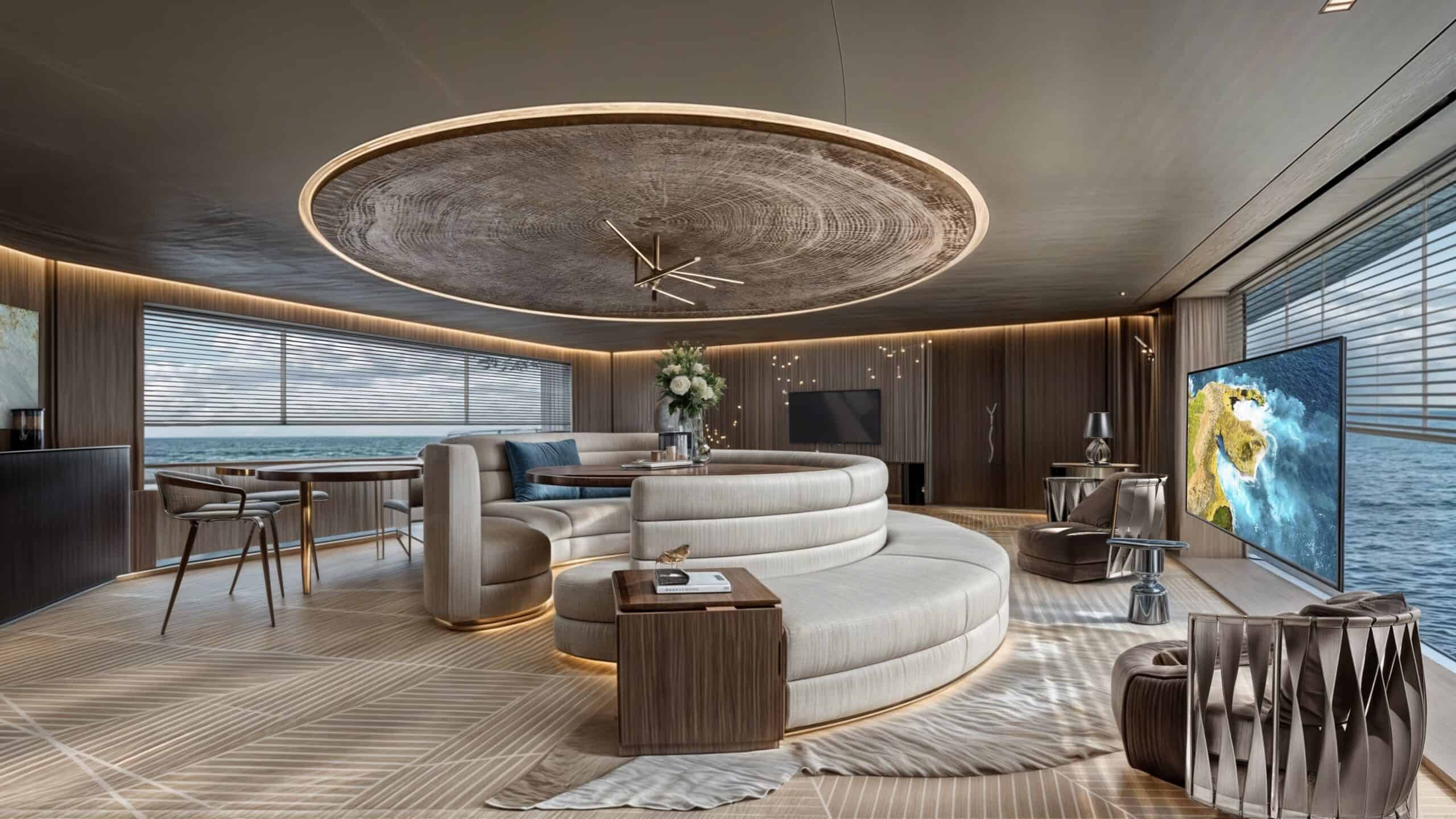 Il tema “Dalla terra al mare” ha guidato la progettazione, invitando a trasferire sull’acqua il comfort e il linguaggio estetico del mondo domestico, ispirandosi a quattro coppie di armatori immaginari: James Bond e Honey Ryder, Penelope e Ulisse, Warhol e Basquiat, Federico Fellini e Giulietta Masina. Quattro archetipi per trasformare lo yacht in un luogo narrativo dove mito, glamour e arte contemporanea dialogano con il design.