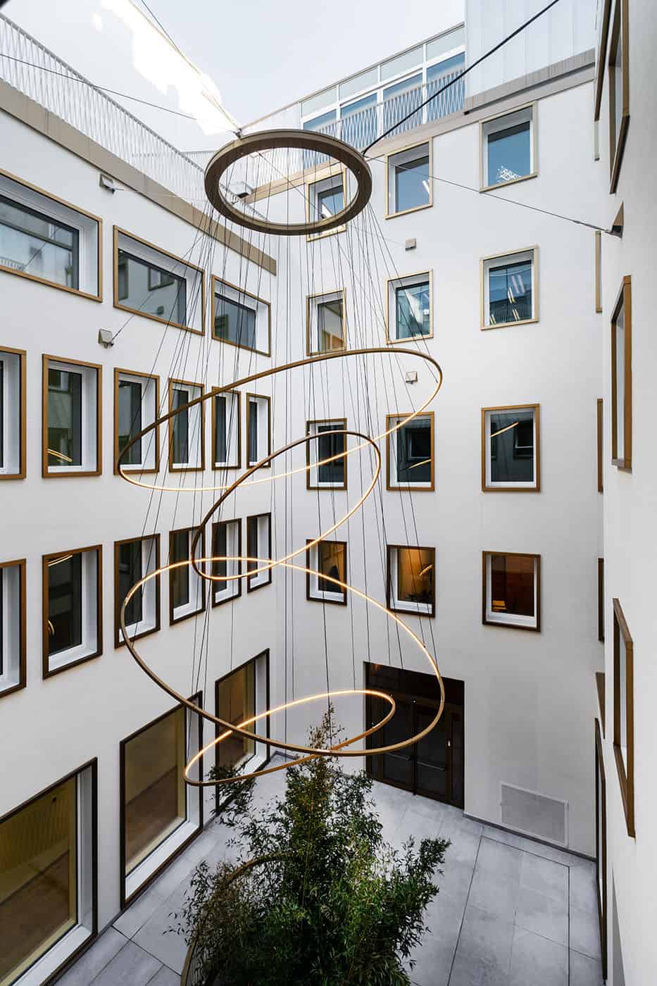 Attraverso un calibrato utilizzo di materiali nobili e forme innovative si mantiene un legame con il passato introducendo leggerezza, fluidità ed eleganza. Un continuum dinamico tra i diversi ambienti si percepisce sin dall’ingresso dove, grazie alle ampie vetrate della corte principale, è possibile leggere la profondità dell’edificio e il susseguirsi di ampi spazi come la galleria e aree informali e flessibili caratterizzate dalla presenza di elementi eterei e pareti verdi.