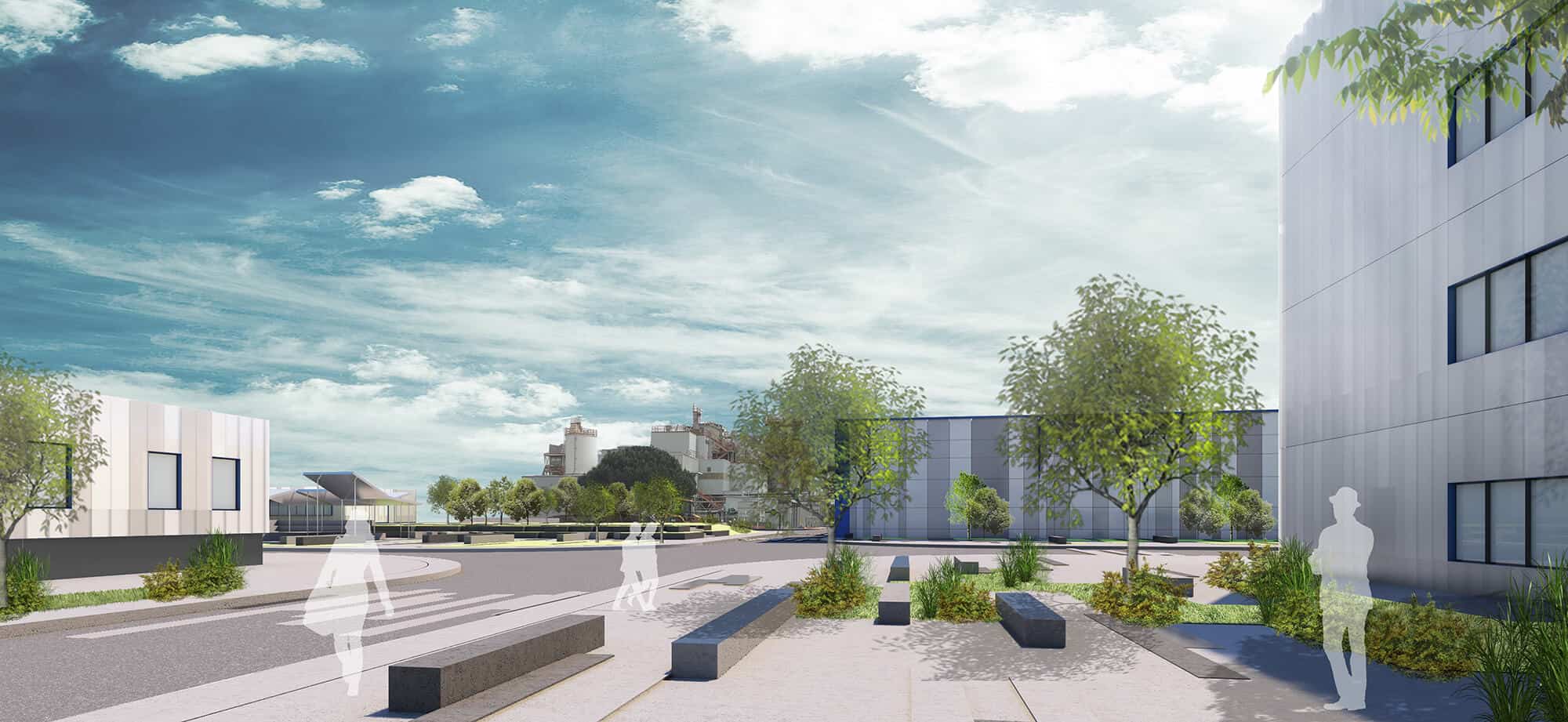 Importante elemento del progetto è la nuova “piazza”, sita nel punto di intersezione tra cardo e decumano, una parte della quale sarà dedicata a piccoli eventi. La pavimentazione delinea il confine tra spazi verdi e spazi pubblici, trasformandosi gradualmente in sedute e infine in un piccolo anfiteatro.