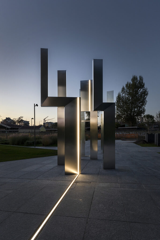 Le due piazze – tra cui piazza Fernanda Pivano – sono connesse da un portale scenografico alla base dell’edificio, mentre oltre 4.000 mq di verde creano un corridoio paesaggistico continuo. Nuove alberature, betulle, spazi per la biodiversità e arredi smart trasformano l’area in uno spazio aperto e permeabile, restituito alla comunità.
